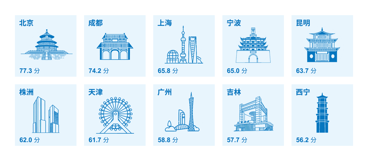 评估结果显示,经过四年的持续监测与政策引导,中国城市在“双碳”行动上已从初期的目标制定阶段全面步入实质性的落实深化阶段。在综合排名中,北京凭借在“气候雄心”维度上的突出表现蝉联榜首,总得分为77.3分。成都、上海、宁波、昆明分列第二至第五位,展现了不同区域中心城市的引领作用。