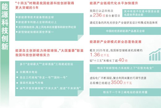 能源科技的创新,是发展的澎湃动力。白鹤滩水电站、第四代高温气冷堆等多个“全球最大”“全球首座”工程建成投运,新能源等技术装备领跑全球,新能源专利数占全球四成以上。建成全球最大的可再生能源体系离不开强大的科技创新能力,也为全球低碳转型贡献了中国力量。