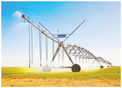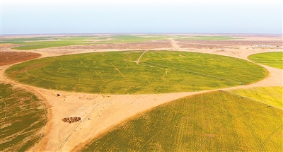 在埃及沙漠腹地,中国中曼集团的喷灌系统正在进行灌溉作业。郝东磊摄(影像中国)