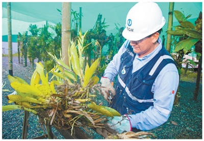 查格亚水电站当地员工在苗圃中精心护理兰花。曹 哲摄